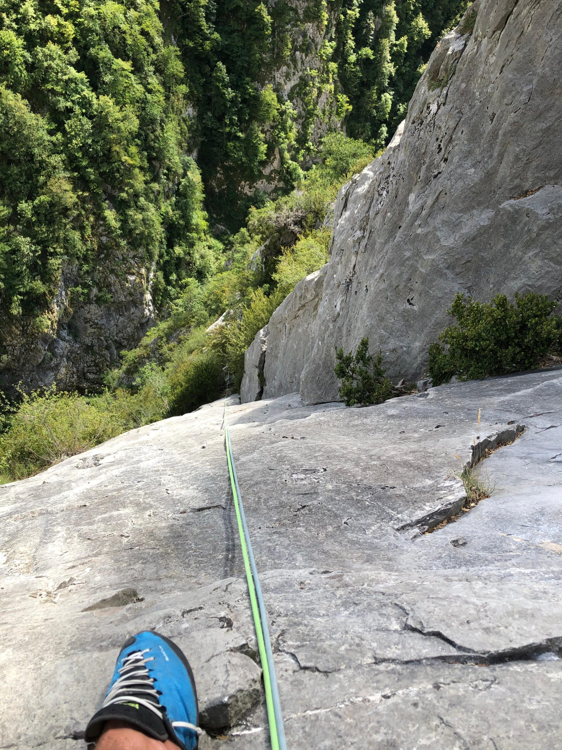 On démarre tranquillement à 11h. Rien n’est a jeté sur les 200m d’escalade, aussi bien les 5m de départ athlétique (et là pourquoi ils n’ont pas taillé un bac !?) , que le dièdre parfait sur deux longueurs. C’est pile ce qu’il nous fallait, des 5c+ et des 5c- 😅 On en rigole car toutes les longueurs sont 5c suivant les topos… Les cotations historiques sont parfois surprenantes !