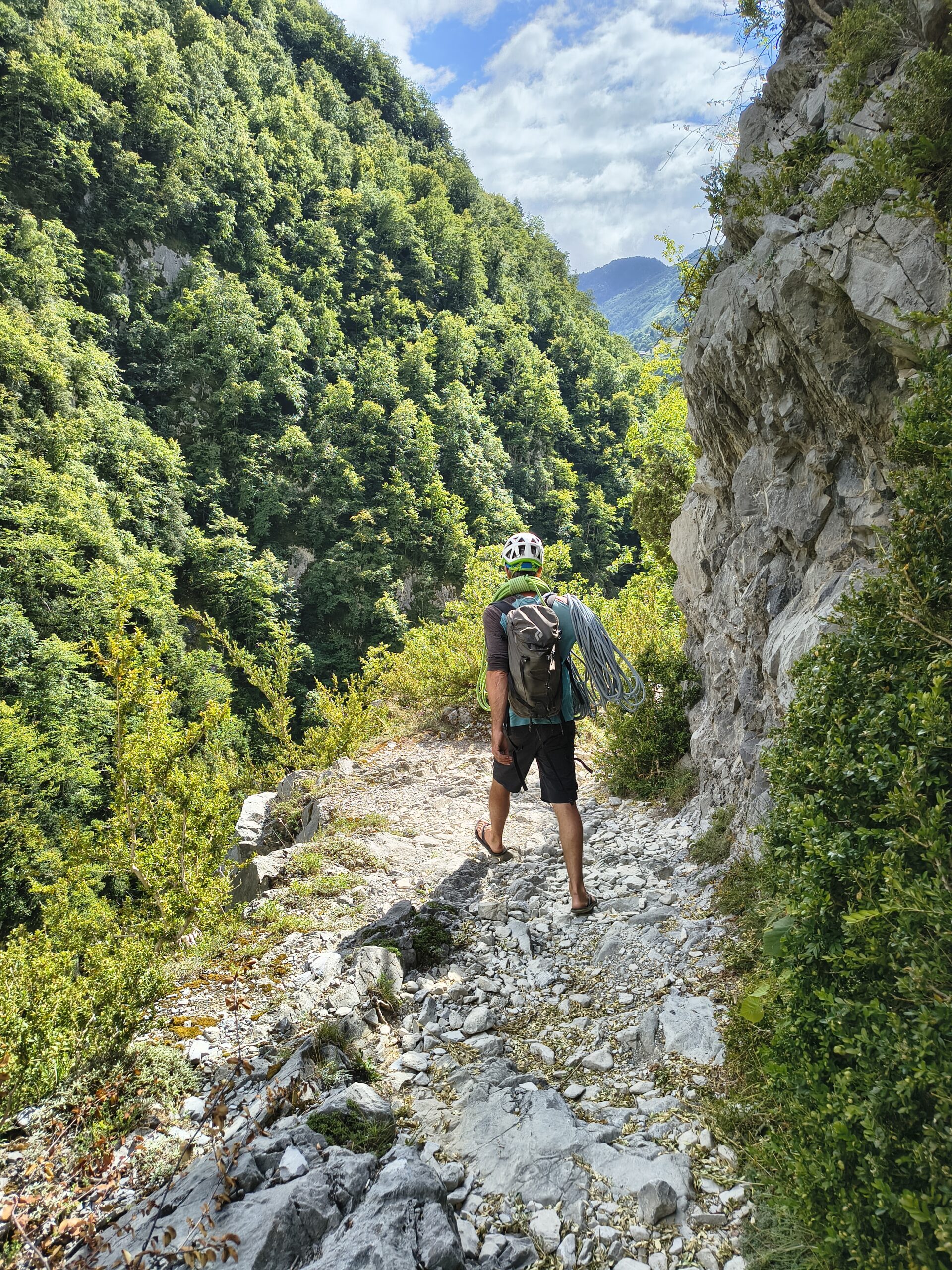 Nous voila tous les deux avec Nath en direction de La Mâture, vallée d’Aspe. On va prendre de l’altitude dans une grande voie. Ca fait bien longtemps que nous n’avons pas pratiqué ensemble. On décide d’aller grimper Passagers du Vent, LA grande classique de La Mâture. Mais avant ça on doit passer par le chemin taillé dans cette belle dalle (on ne taille pas les prises, et on ne taille pas les falaise me dit l’arbitre). Ils sont fous ces gaulois des années 1770 d’avoir taillé sur 1 km ce chemin. Pas d’internet et pas d’escalade à l’époque, il fallait bien s’occuper.